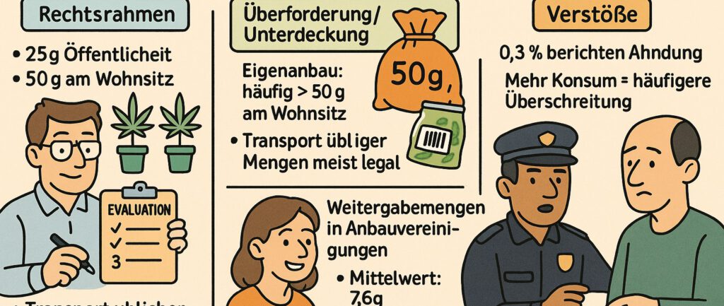Der Transport üblicher Konsummengen ist in der Öffentlichkeit durch die 25-Gramm-Grenze in den meisten Fällen abgedeckt und rechtlich unproblematisch. Anders verhält es sich am Wohnsitz: Durch Eigenanbau überschreiten viele Haushalte zwangsläufig die 50-Gramm-Grenze, da schon drei Pflanzen Erträge oberhalb dieses Limits hervorbringen können.